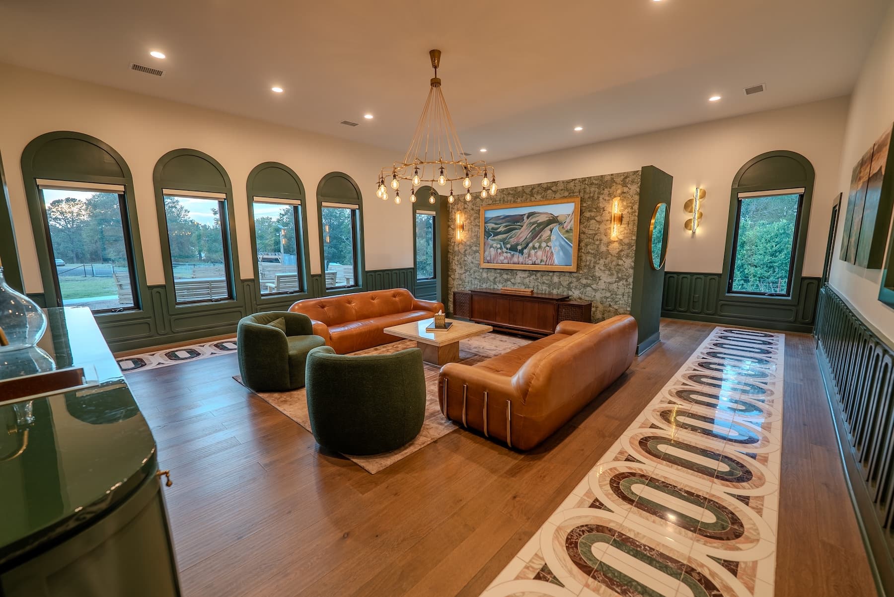The chapel’s interior unfolds as a progression of inviting atmospheres, its layered, individualistic aesthetic rooted in thoughtful craftsmanship. Warm hardwood floors anchor the space, complemented by brick accent walls that whisper of local heritage. Plush leather chairs and fabric pews, paired with ornate rugs and pendant lanterns, create a restorative ambiance. A piano and large TV screen add a touch of sophistication, while energy-efficient lighting ensures a sustainable glow, harmonizing luxury with nature.