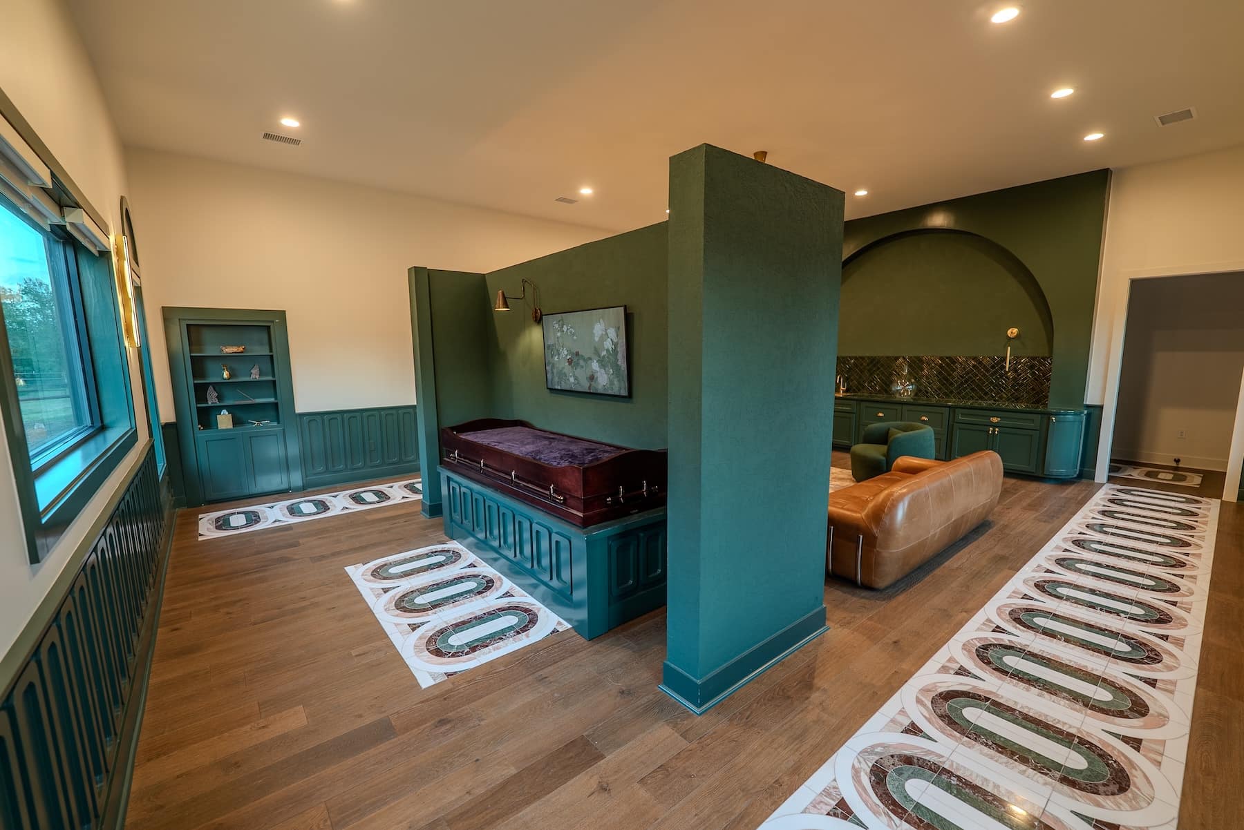 The crematory’s sculptural construction unfolds as a progression of atmospheres, each space layered with a distinctive, individualistic aesthetic. The exquisite 20-person viewing suite, bathed in soft lighting and adorned with plush leather seating, radiant chandeliers, and sophisticated green wainscoting, creates an intimate yet opulent ambiance. In the retort room, shou sugi ban paneling—hand-charred to perfection—adds a tactile, artisanal warmth, harmonizing modern luxury with natural textures. Every element, from the closed-circuit security system to the pristine, state-of-the-art equipment, is designed for privacy and peace.